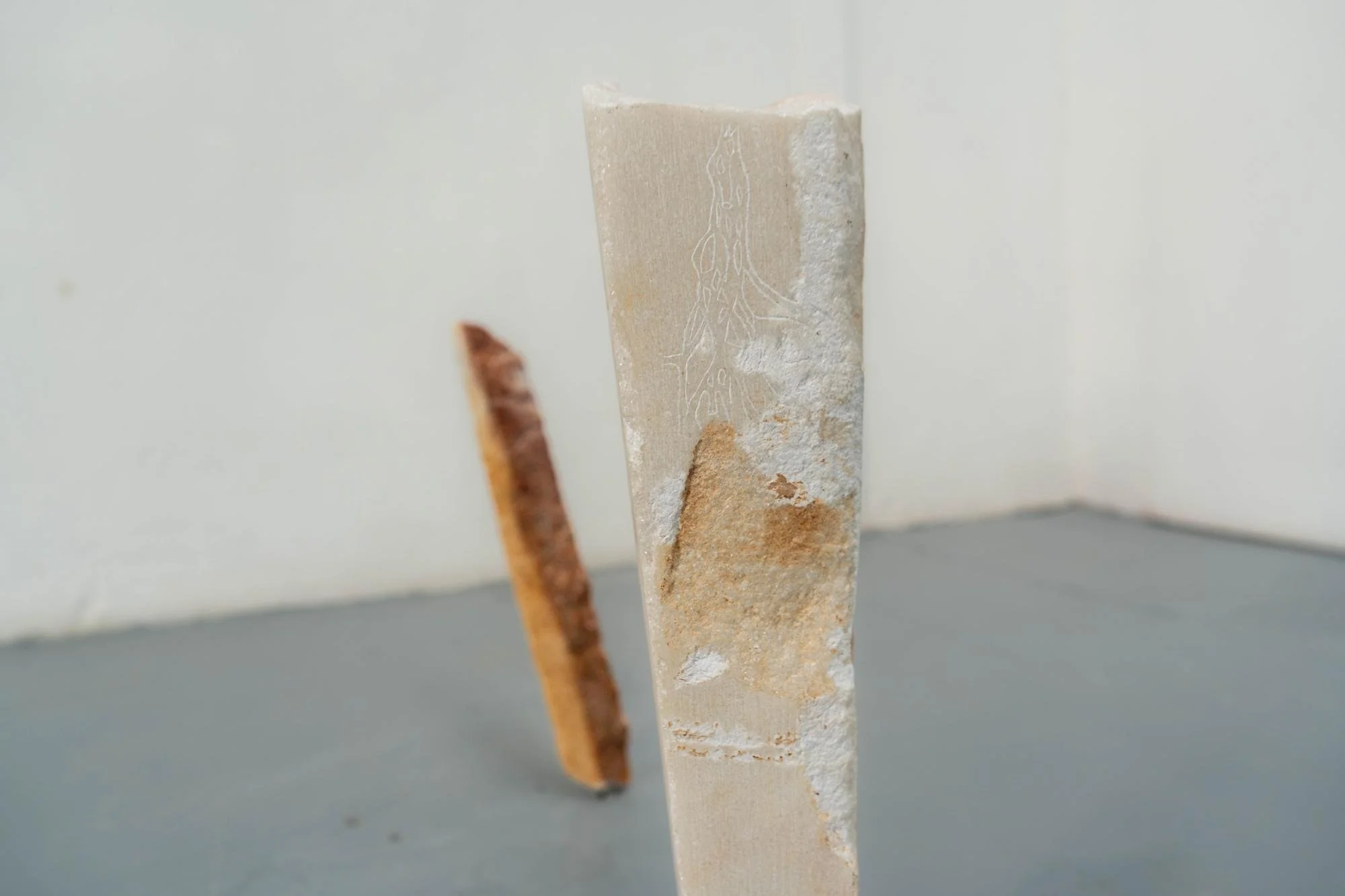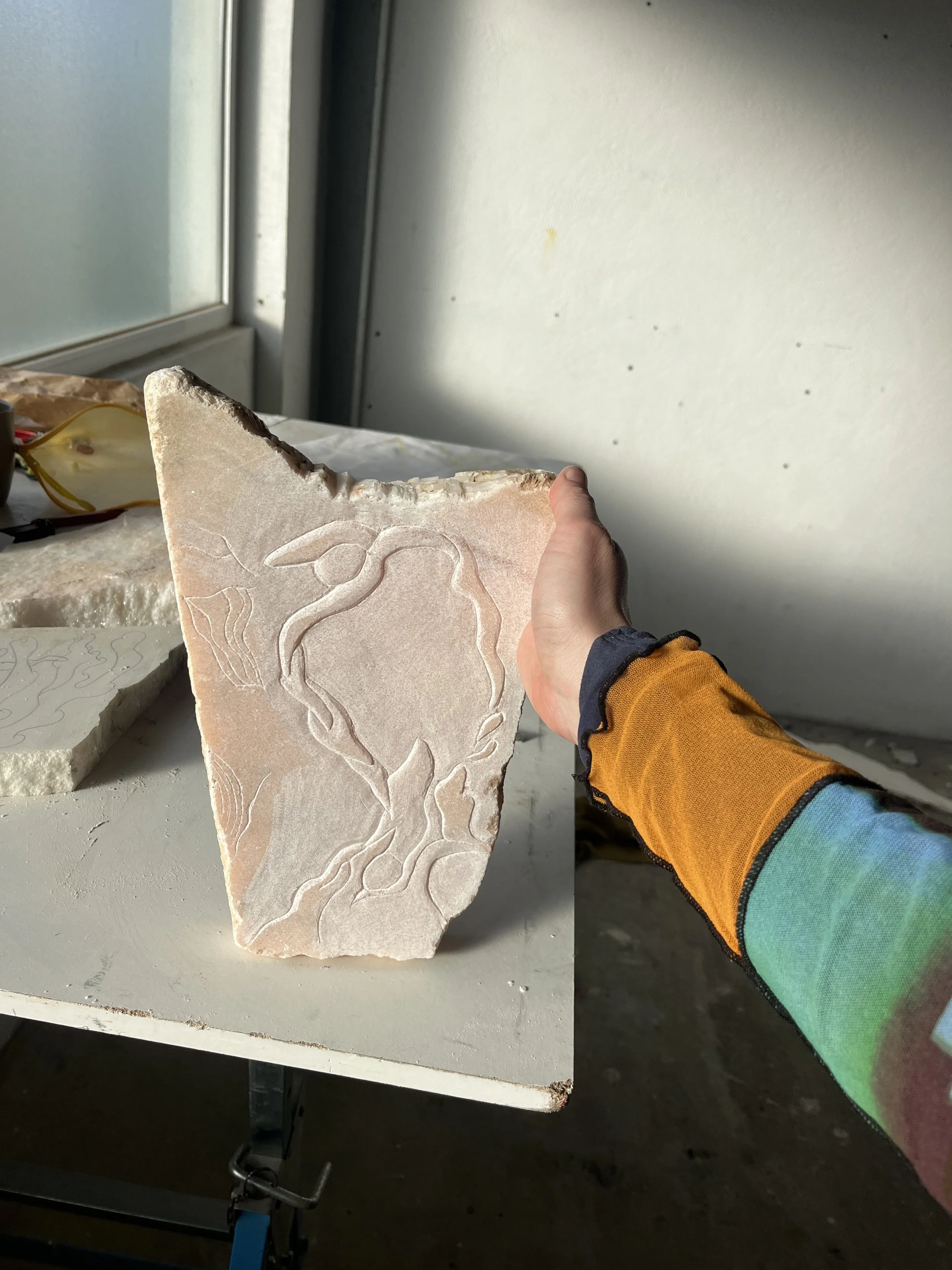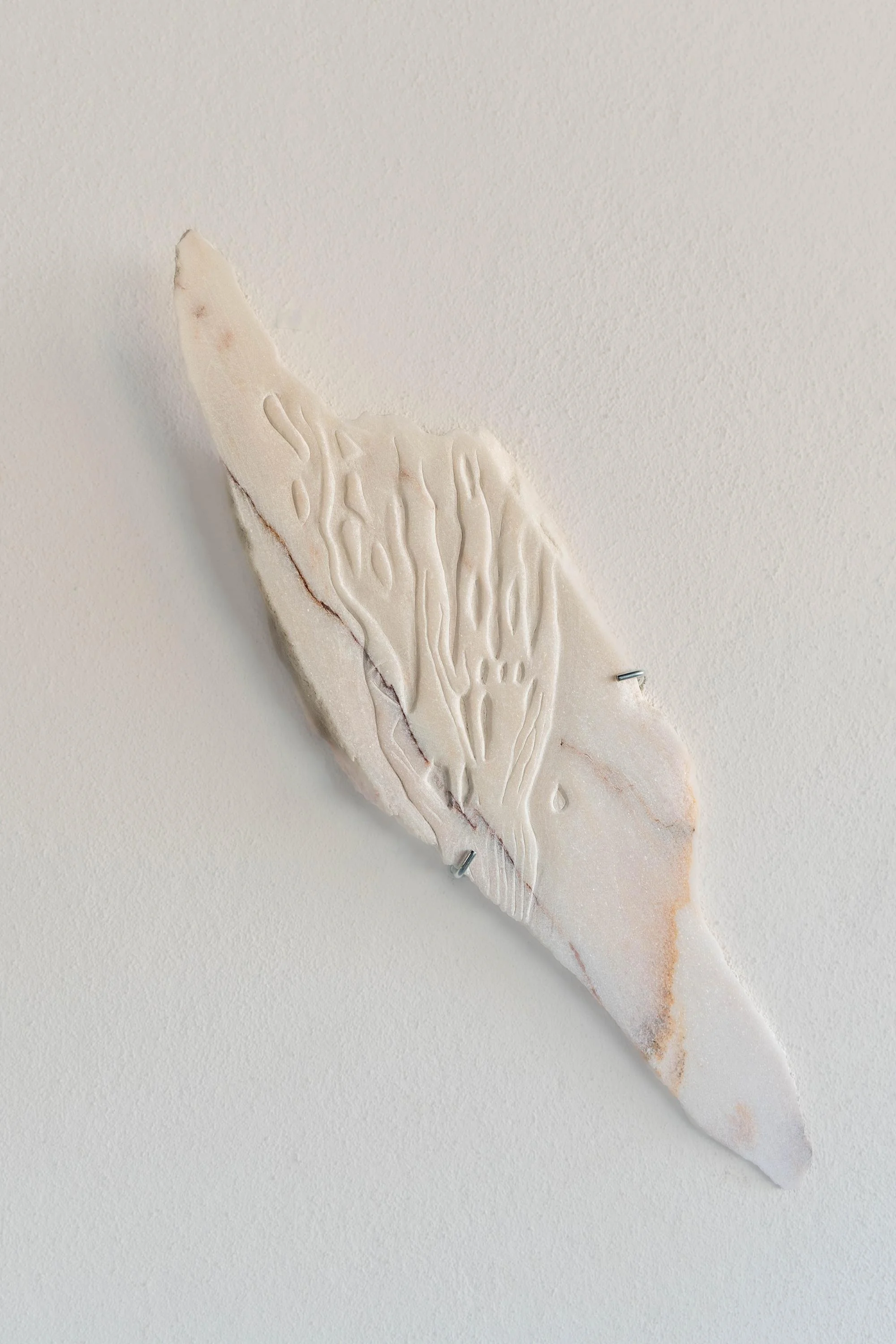 E: Sim, comecei a investigar a história do mergulho há alguns anos e um dos primeiros métodos registados envolvia a utilização de mármore ou outros pesos de pedra. Os mergulhadores utilizavam estas pedras para descer e subir mais rapidamente, e o peso era ligado a uma corda para que alguém no barco os pudesse puxar de novo para cima. Interessei-me pela forma como as diferentes técnicas de mergulho moldam a experiência de mergulho. Ao mesmo tempo, fiquei fascinado com a forma como o próprio mármore é formado (pequenas conchas e restos de coral comprimidos ao longo do tempo) e como essa ligação material também se relaciona com o mar. Não tinha a certeza absoluta de como isto se iria transformar num projeto, mas encontrei uma residência de mármore fantástica na Grécia. E algumas das ilhas gregas também têm uma história rica de mergulho com este método, para recolher esponjas. Aprender a trabalhar com mármore atraiu-me porque exige paciência e conhecimento do material. Queria aprender as técnicas de escultura, estudar as antigas práticas de mergulho e tinha algumas ideias vagas de criar relevos em mármore que pudessem comunicar esta história.
