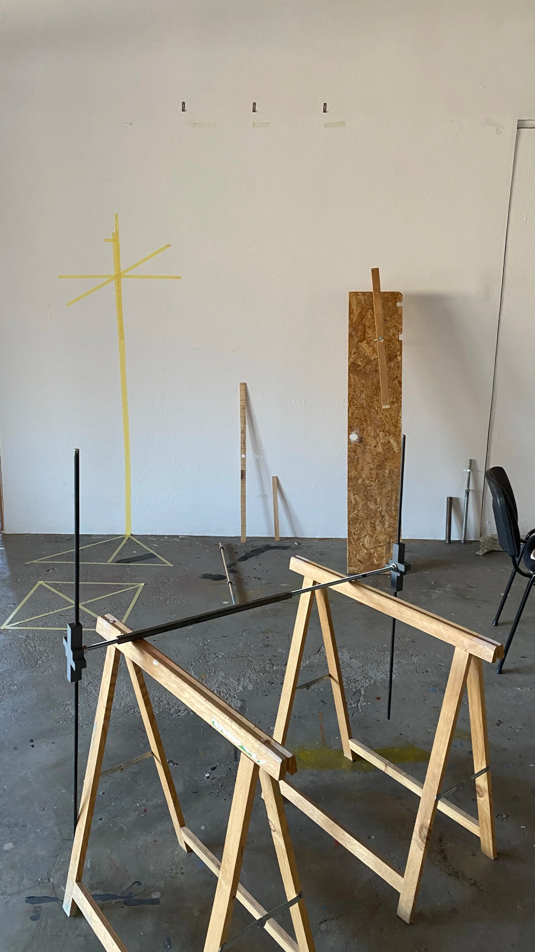 Perguntaram-me, durante a residência de antigos alunos, se eu tinha ou não um plano... Quão intuitivo ou planeado é o seu processo? Para mim, acho que há um tempo e um lugar para ambos os métodos de trabalho. Com o trabalho que desenvolvi na PADA alumni, no mês passado, estava a trabalhar com um plano flexível, mas aberto à intuição. Vim com a intenção de querer compreender o movimento - como é que se faz, que tipo de movimento? Por isso, comecei por testar ideias rapidamente, utilizando os bocados de sucata da oficina. A partir daí, é preciso ajustar - onde é que o comprimento e o peso desempenham um papel? O que é que acontece quando se cria mais ou menos tensão? Assim que compreendi melhor esta questão, estava pronto para fazer a versão seguinte. Então penso: de que ferramentas preciso? De que materiais ou ferragens preciso? Quais são as dimensões? Utilizo um pouco de fita adesiva para perceber isto.